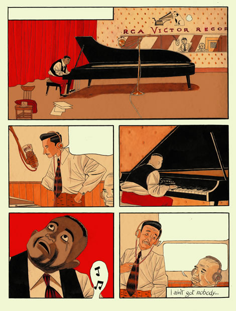 Quando mi sono trasferito a Parigi, nel 2000, ascoltavo TSF Jazz, la migliore radio jazz che si possa trovare in Europa. Ogni mattina, per mezz'ora, raccontavano la storia di un musicista. Alla domenica la repolica integrale. Ascoltavo la storia di FATS dicendomi che sarebbe stato un magnifico fumetto. Così in breve, avevo appena finito 5, chiamai Sampayo, che era, oltre che amico, un mio mito di infanzia. Gli chiesi se gli piaceva l'idea di scrivere per me una sceneggiatura su FATS WALLER. E tutto cominciò così. Un lavoro che poi sarebbe stato lungo e complicato, particolarmente amato e che ha vinto qualche premio importante. Un lavoro che adesso guardo con molto affetto.